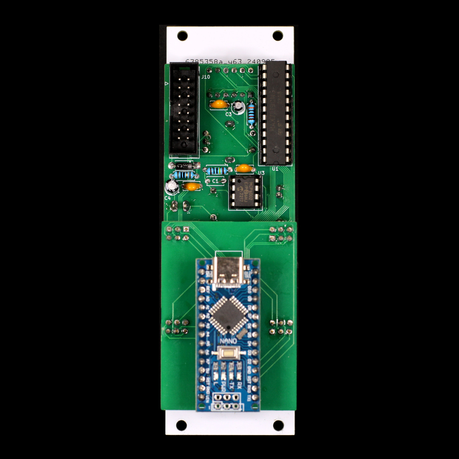 A clock and clock divider, built around an Arduino Nano. The settings are controlled by a rotary encoder and are displayed on a three digit seven segment display, controlled by a MAX7219 display driver chip. The clock has inputs for an external clock and to reset the clock divider which are both buffered through a MCP6002 op amp chip.